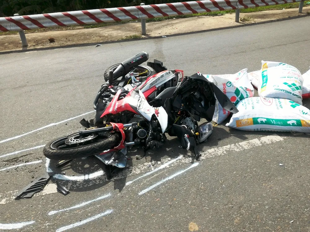 Vụ va chạm khiến thanh niên đi mô tô té xuống đường và kẹt ở gầm xe tải, được mọi người cứu ra, đưa tới bệnh viện trong tình trạng nguy kịch.