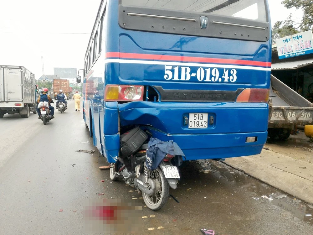 Lúc này xe máy 71C3-178.06 do một thanh niên khoảng 30 tuổi chở theo một cô gái đã bất ngờ lao xe thẳng vào phần đuôi ô tô khách.