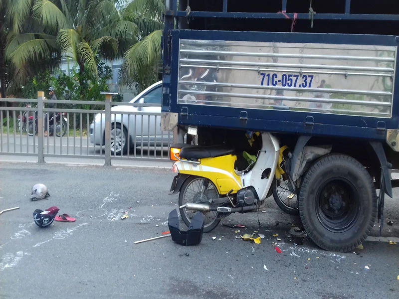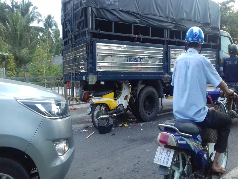 Chiếc xe máy chui tọt vào gầm xe tải trong tư thế dựng đứng, hai người đi xe máy chấn thương nặng phải nhập viện cấp cứu.