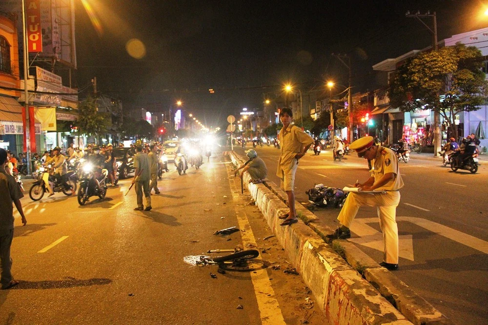 Tại hiện trường, chiếc xe máy bị gãy đôi hư hỏng hoàn toàn, dầu nhớt chảy ra đường, nhiều mảnh vỡ văng tung tóe; xe ô tô bị móp phần đầu, lốp xe bị vỡ, kính chiếu hậu bị gãy.