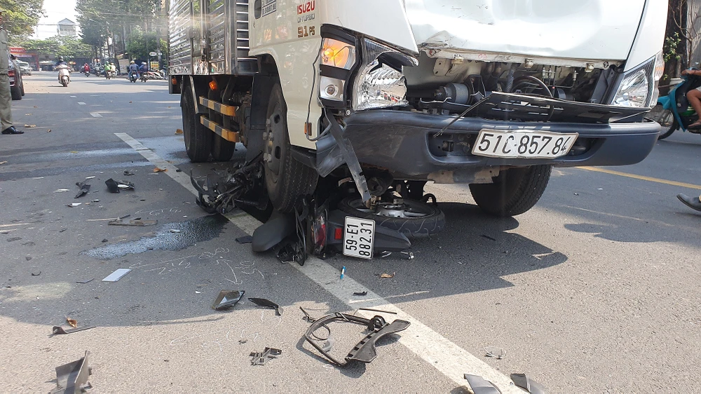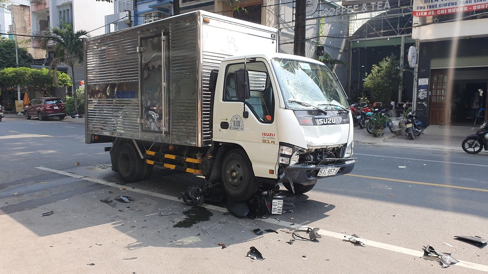 Tại hiện trường, chiếc xe máy bị bể nát, biến dạng hoàn toàn dưới gầm xe tải. Mảnh vỡ từ xe máy văng khắp nơi. Riêng xe tải cũng bị hư hỏng phần đầu và kính chắn gió.