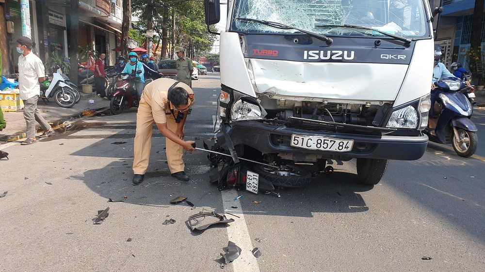 Đến hơn 11 giờ ngày 14-1, Công an quận Bình Thạnh, TP.HCM vẫn đang xử lý hiện trường, điều tra nguyên nhân vụ tai nạn giữa một xe máy và một xe tải trên đường Nguyễn Gia Trí nối dài, phường 25, quận Bình Thạnh.