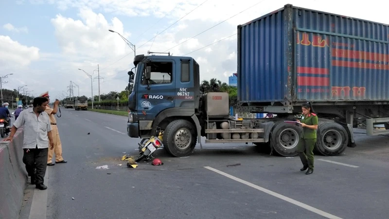 Theo người dân chứng kiến tại hiện trường, khoảng 16 giờ chiều 11-6, xe đầu kéo 89C-067.87 chạy từ bên trong cổng của một công ty để ra QL1A, đoạn phường Khánh Hậu, TP.Tân An, tỉnh Long An.