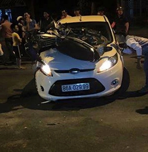 Theo thông tin ban đầu, khoảng 23g ngày 10-2, lái xe Kia biển số 86A-029.99 đang quay đầu xe thì xe máy biển số 86N1-8597 chạy ngược chiều. Do xử lý chậm, xe máy đã tông trực diện vào chiếc Kia rồi văng lên, nằm vắt ngang, dính chặt vắt vẻo trên capo xe hơi.