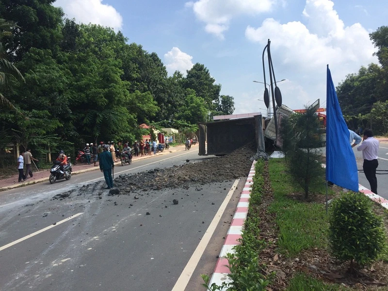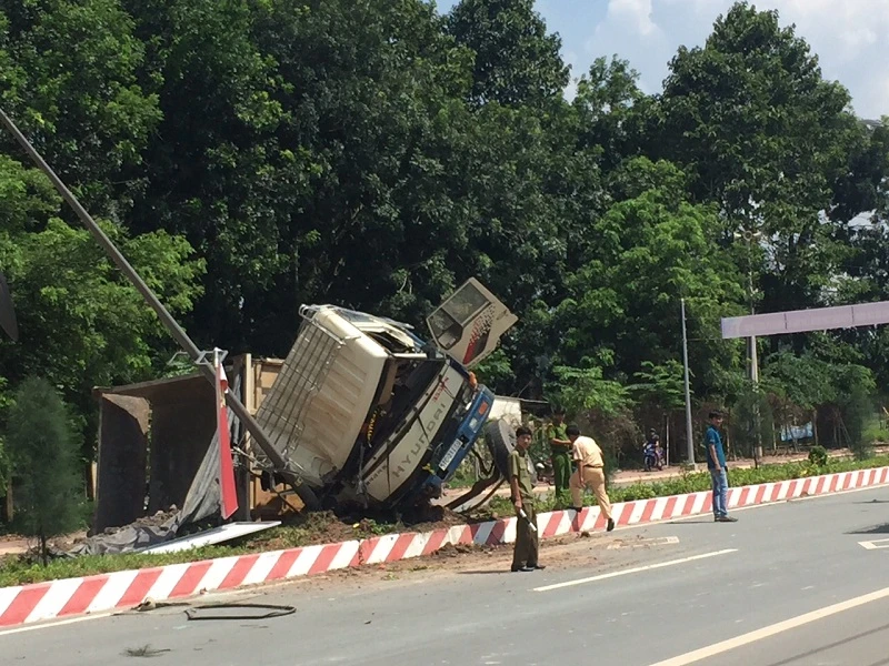 Xe ben đánh tay lái leo lên dải phân cách, lật nghiêng.