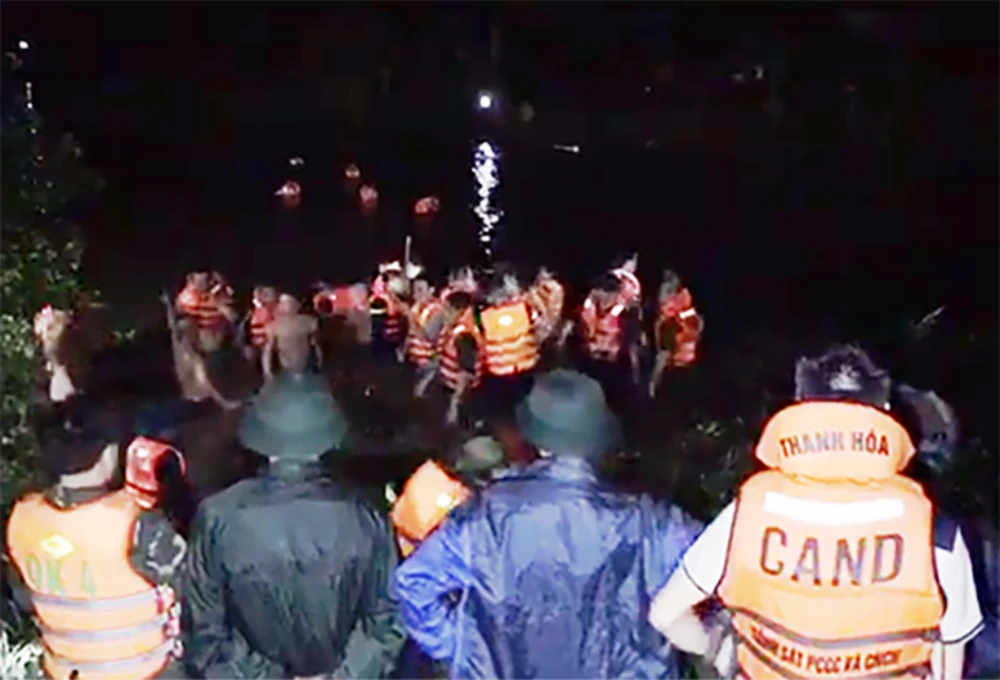 Lực lượng chức năng được huy động tối đa đến hiện trường tìm kiếm các nạn nhân vụ xe máy chở bốn người lao xuống sông.