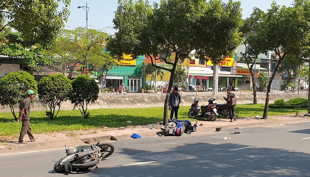 Hai xe máy va chạm, trượt dài trên đường khiến ba người bị thương trên đường Trần Văn Giàu (quận Bình Tân). Ảnh: NT