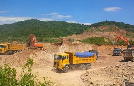 Thời gian qua, mỗi ngày có hàng trăm lượt xe tải chở đất đá ùn ùn chạy ra khỏi cổng Trường bắn 327 thuộc Trường Quân sự Quân khu 5 nằm trên quốc lộ 14B (phường Hòa Thọ Tây, quận Cẩm Lệ, TP Đà Nẵng).