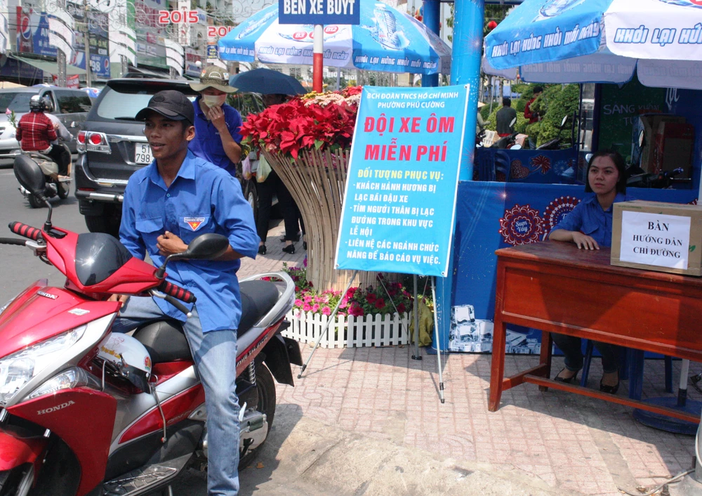 Để phục vụ cho du khách, các Đoàn viên thanh niên phường Phú Cường đã chuẩn bị 10 chiếc xe máy. Đội xe ôm miễn phí này sẽ phục vụ cho những khách bị lạc bãi đậu xe, tìm người thân bị lạc đường hoặc cần liên hệ với cơ quan chức năng địa phương để làm việc với bán kính dưới 20km.