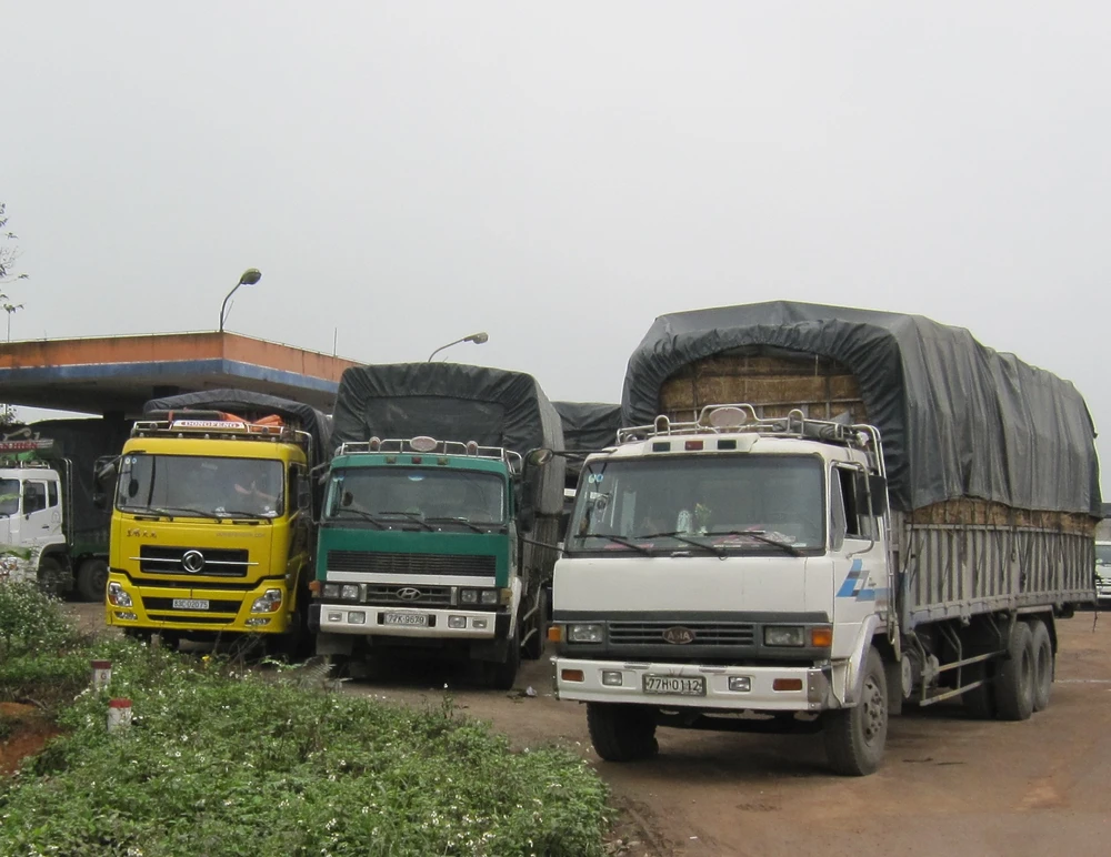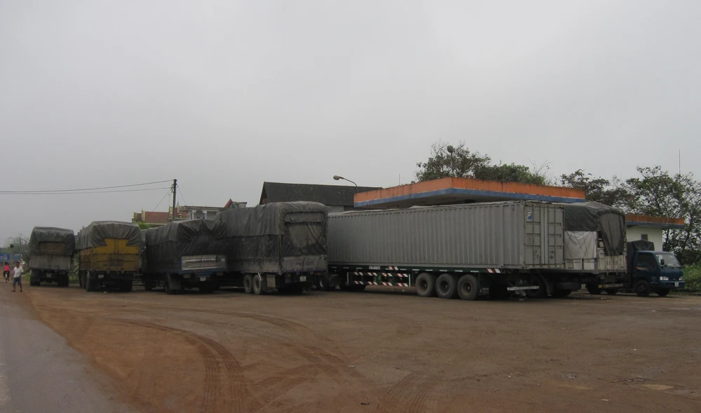 Dãy xe tài dừng lại hai bên đường chờ cơ hội qua trạm cân. Ảnh: VIẾT LONG