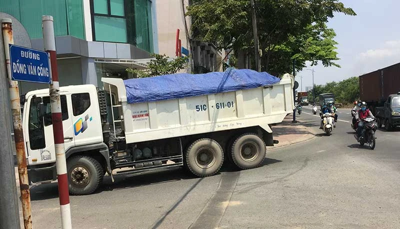 Một xe ben chở quá tải vừa xuống khỏi cầu Giồng Ông Tố 2 trên đường Đồng Văn Cống là rẽ phải vào đường nhánh để né trạm cân số 5 phía trước. Ảnh: L.ĐỨC