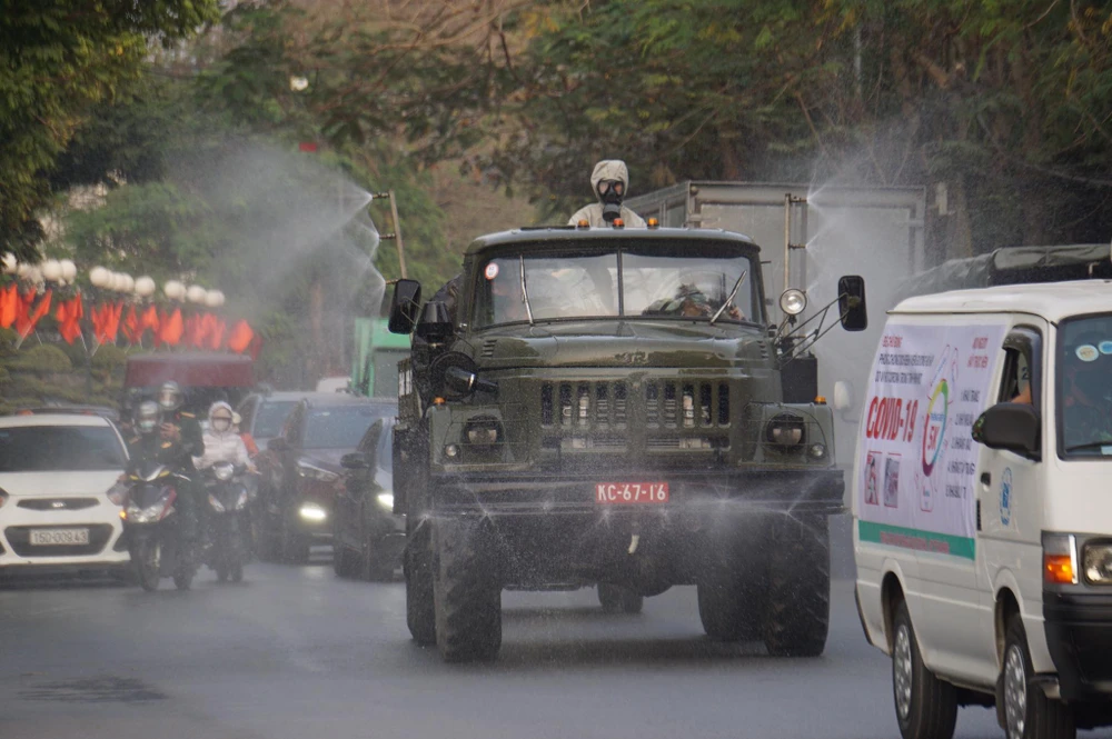 Theo đó, lúc 15 giờ chiều 29-1, đoàn xe phun hóa chất của lực lượng chức năng đã tiến hành phun hóa chất tại các tuyến phố trung tâm TP như Trần Phú, Quang Trung, Nguyễn Đức Cảnh, Điện Biên Phủ, Hoàng Diệu, Đinh Tiên Hoàng, Hoàng Văn Thụ, Lê Lợi, Cầu Đất.