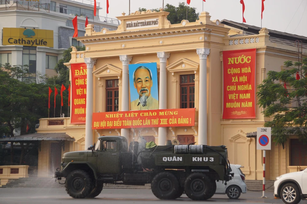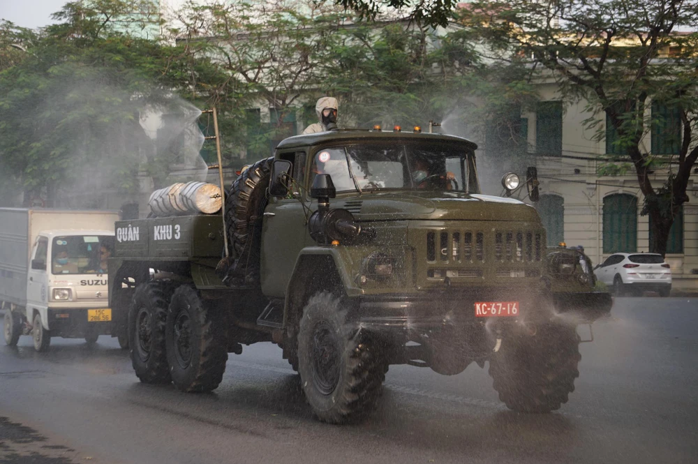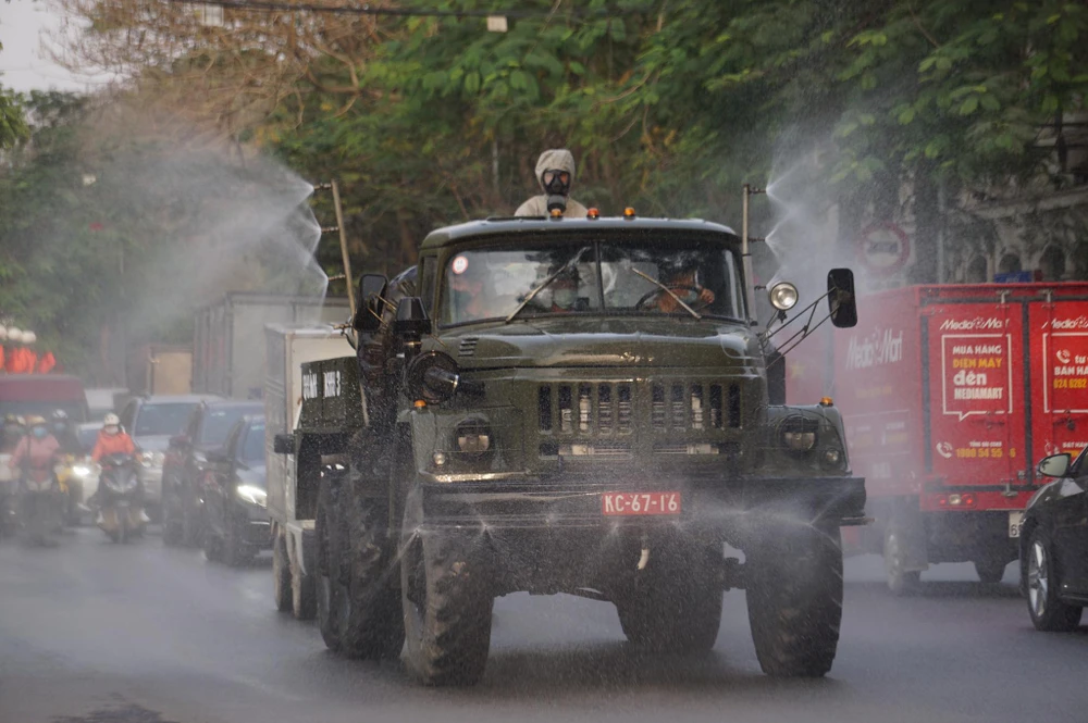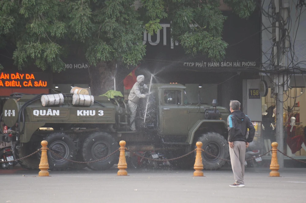 Xe quân đội được sử dụng phun hóa chất khử trùng tại các tuyến phố trung tâm TP Hải Phòng.