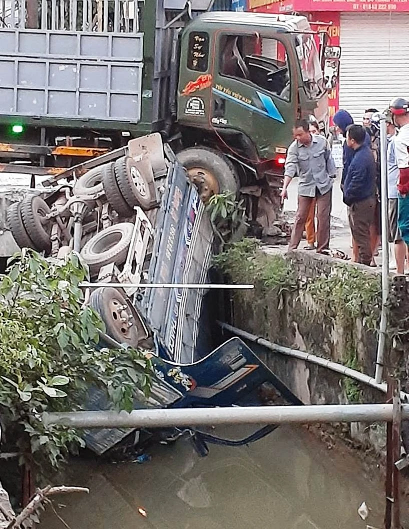 Cú tông mạnh khiến xe tải 36C-230.86 lật ngửa xuống kênh thoát nước. Sau khi xảy ra vụ tai nạn, người dân và cơ quan chức năng đã nỗ lực xuống kênh nước cạy cửa xe tải đưa tài xế đi cấp cứu.
