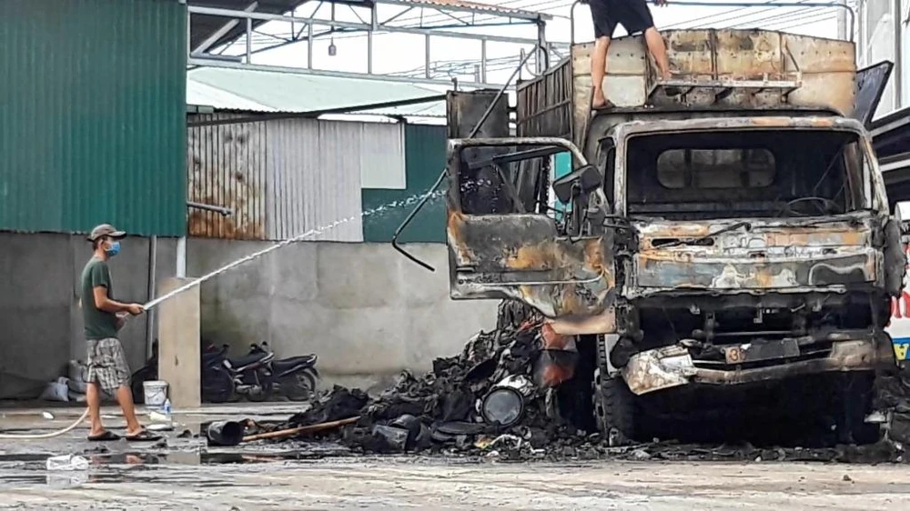 Khi đó, một ô tô tải chở hàng đang để trong sân một hộ dân trên đường Thuận Giao 07 thì bất ngờ bốc cháy.