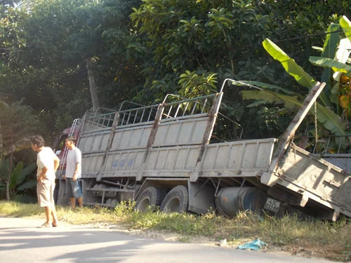 Xe tải gây tai nạn bị nghiêng xuống hố gần đó.