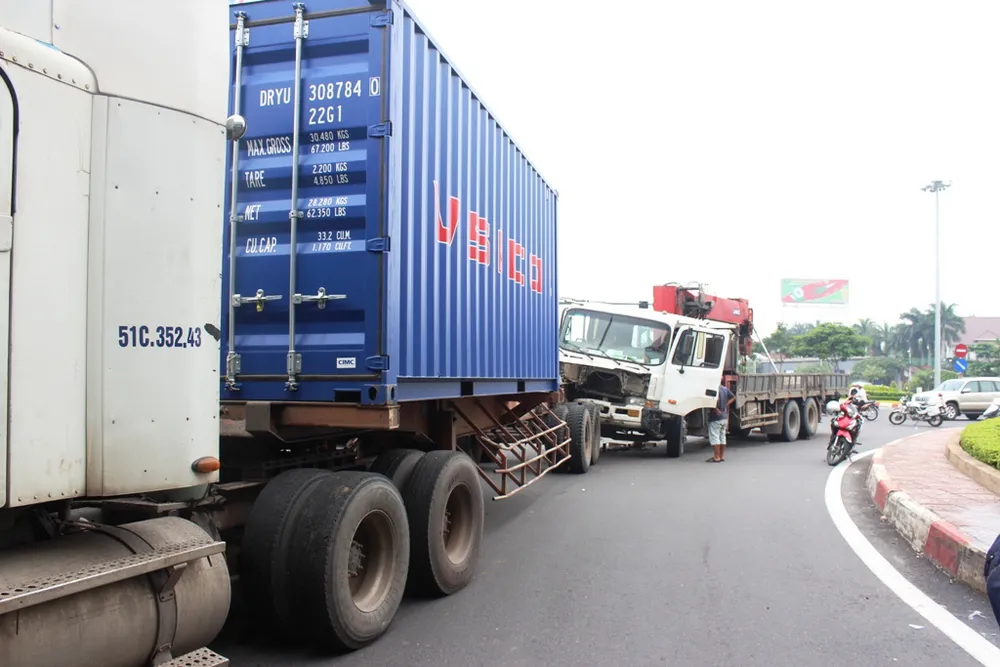Khi đang ôm cua tại vòng xoay ở ngã tư Bình Triệu (đoạn chạy qua P. Hiệp Bình Chánh, Q. Thủ Đức, TP.HCM) thì bị xe tải cẩu BKS: 51C-275.52 tông vào đuôi xe. Cú tông mạnh đã làm phần đầu xe tải cẩu hư hỏng nặng, mắc kẹt vào đuôi xe container.