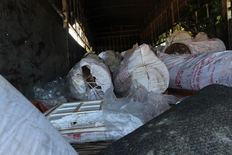 Qua kiểm tra, trên xe có khoảng 100 bao tóp mỡ với tổng trọng lượng khoảng 6 tấn, hầu hết bốc mùi hôi thối.