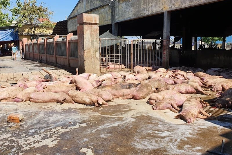 Xác heo chết nằm la liệt gần lò mổ. Ảnh: ND