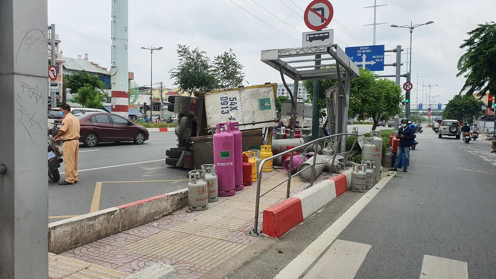 Tại hiện trường, nhiều bình gas lăn ra đường đã được người dân hỗ trợ thu gom lại. Chiếc xe tải hư hỏng nhẹ, va chạm với phần mái che trên dải phân cách làm phần này hư hỏng.
