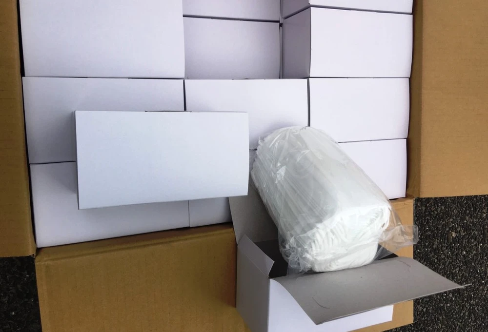 Những khẩu trang màu trắng không nhãn mác bị tạm giữ. Ảnh: Biên phòng cung cấp