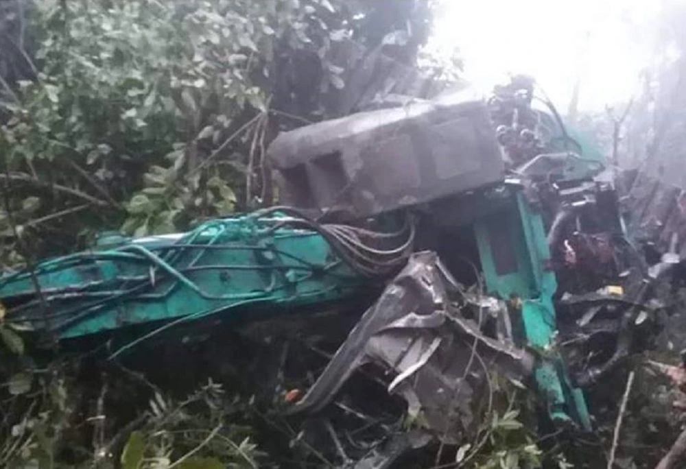 Ghi nhận tại hiện trường, chiếc xe tải và máy xúc bị biến dạng, hư hỏng nặng, nhiều đồ đạc trên xe vương vãi khắp nơi. Thời điểm xảy ra tai nạn, khu vực xe bị rơi xuống đang có mưa và sương mù nên chưa thể xác định được danh tính tài xế cũng như biển số xe.