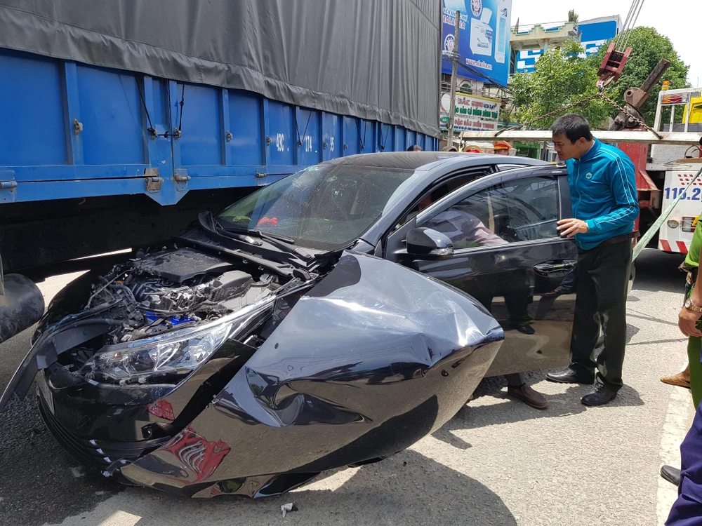 Vụ va chạm khiến xe ô tô bị kéo lê vào gầm xe tải và hư hỏng nặng phần đầu, rất may là không có ai bị thương.