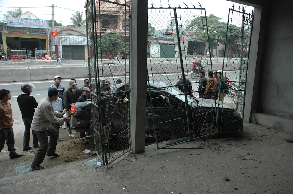 Cú tông quá mạnh, xe tải đã đẩy xe con bay vào nhà dân. Chưa dừng, chiếc xe con do bị tông mạnh từ phía sau nên đã băng lên vỉa hè đâm sập cổng sắt một nhà dân.