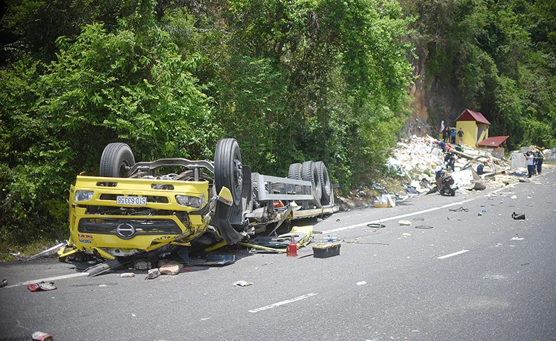 Chiều 12-5, các lực lượng chức năng khám nghiệm hiện trường để điều tra nguyên nhân vụ tai nạn giao thông xảy ra trên quốc lộ 1 đoạn qua đèo Cù Mông thuộc TP Quy Nhơn (Bình Định).