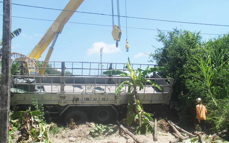 Tiếp đó, xe tải tông vào bà Nguyễn Thị Thanh Hiền (46 tuổi, ngụ xã Hòa An, huyện Phú Hòa) đang đứng bên lề đường gọi điện thoại, cuốn bà Hiền vào gầm xe. Trước khi dừng lại, chiếc xe tải còn tông sập một phần của tiệm gia công cửa sắt.