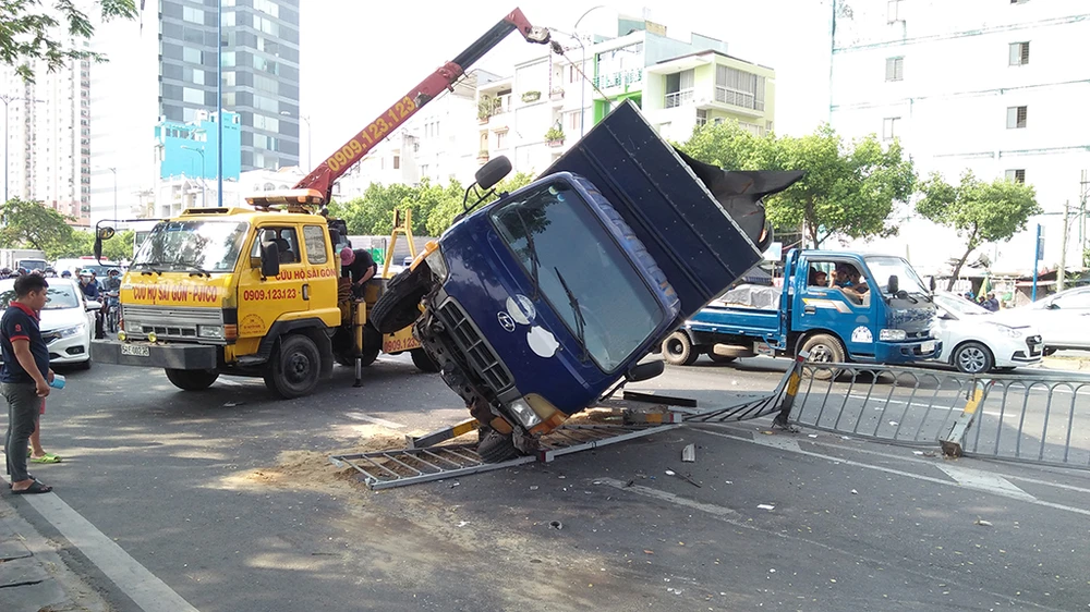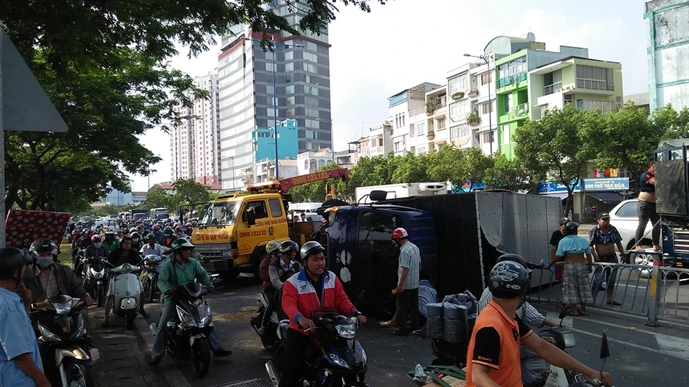 Tại hiện trường, chiếc xe tải hư hỏng nặng, vỡ thùng, dầu nhớt xe đổ tràn trên mặt đường, giao thông trên đại lộ Võ Văn Kiệt ùn tắc nghiêm trọng, hàng ngàn phương tiện nối đuôi nhau xếp thành hàng dài.