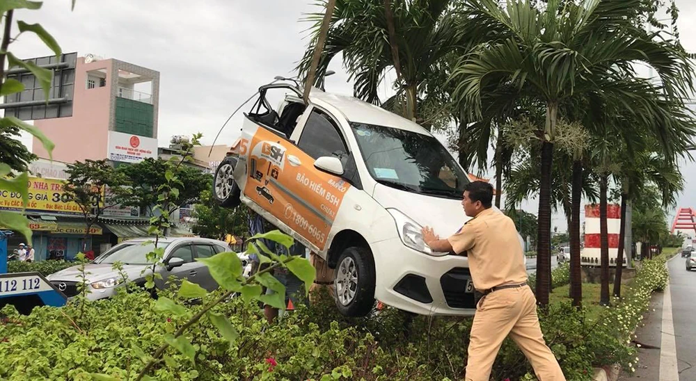 Cú tông mạnh khiến ô tô bị đẩy đi xa, văng lên dải phân cách giữa hai làn đường.