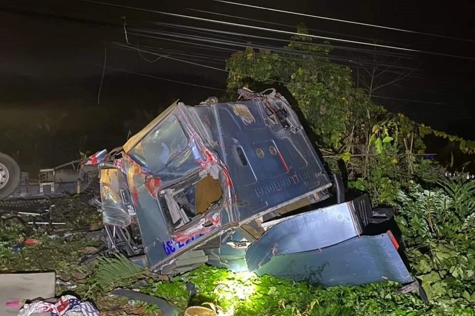 Xe tải bị biến dạng, lật ngửa lên trời. Ảnh: Người dân cung cấp