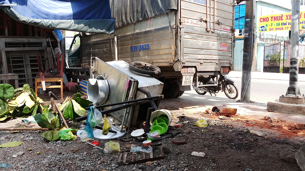 Tại hiện trường, phía trước hai quán ăn lăn lóc đồ đạc, nhiều vật dụng bị cán hư hỏng. May mắn không có thiệt hại về người.