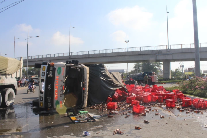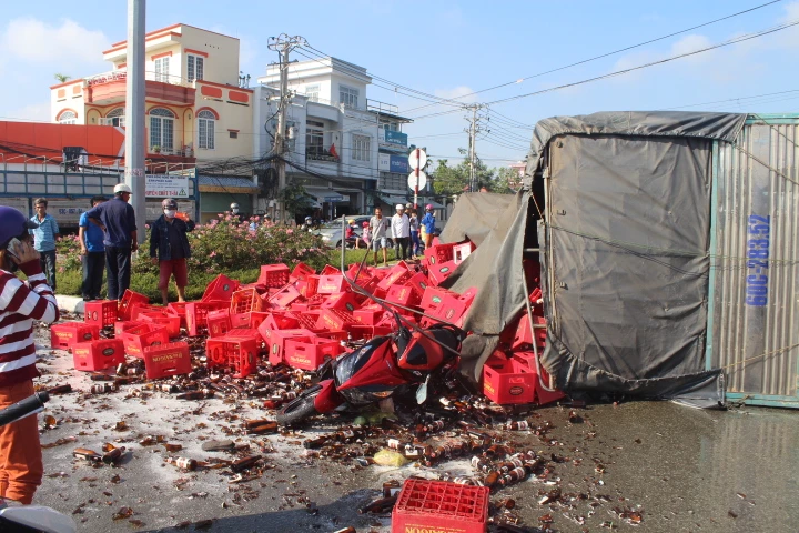 Ghi nhận tại hiện trường cho thấy xe tải bị lật ngang, hàng trăm két bia chai đổ tràn ra đường. Chiếc xe máy bị vùi lấp phía sau.