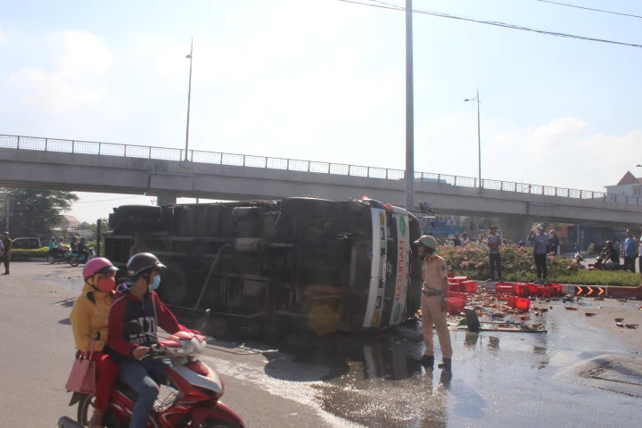 Theo thông tin ban đầu, thời điểm trên xe tải 60C-283.52 lưu thông trên quốc lộ 1K, hướng từ trung tâm TP Biên Hòa về Bình Dương. Khi vừa qua khỏi cầu Hóa An, rẽ phải về hướng xã Tân Hạnh thì bất ngờ bị lật ngang đường.