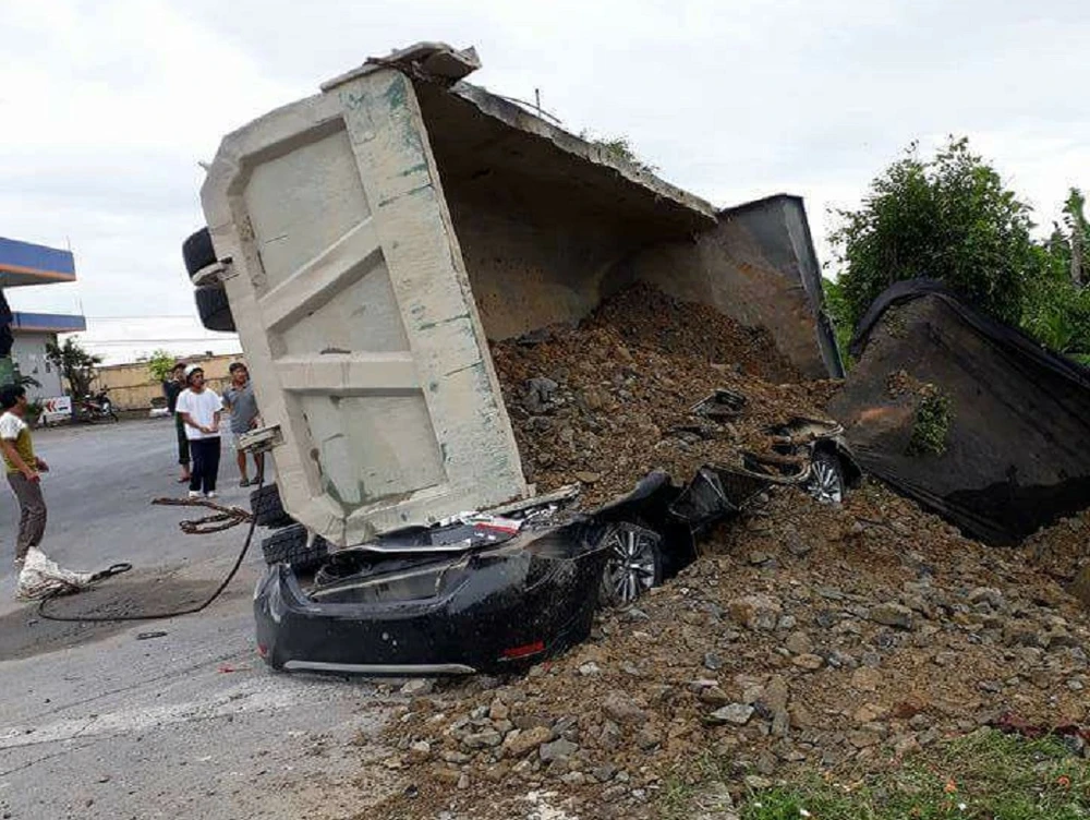 Đến địa bàn trên, bất ngờ xe tải đổ lật, đè xuống ô tô 4 chỗ bẹp dúm.