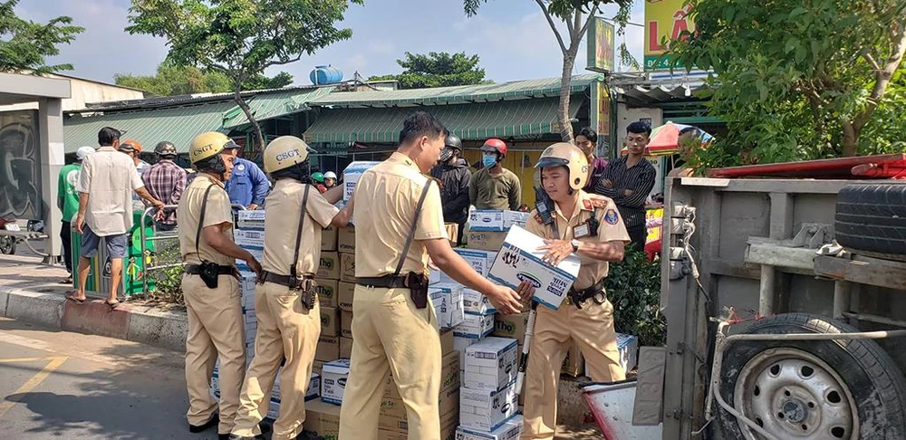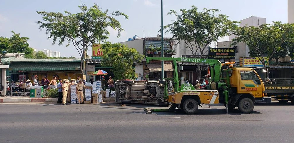 Khi cách địa phận phường 11 (quận Bình Thạnh, TP.HCM) bất ngờ bị nổ lốp và lật nhào. Nhiều thùng sữa trên xe văng xuống đường tung tóe.
