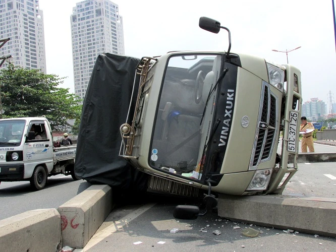 Chiếc xe do tài xế Nguyễn Huỳnh Lộc (41 tuổi) ở huyện Long Hồ (Vĩnh Long) điều khiển. Khi xe đang lưu thông trên cầu Sài Gòn hướng từ Thủ Đức về Q.Bình Thạnh thì bị lạc tay lái, xe cán lên giải phân cách rồi lật nhào.