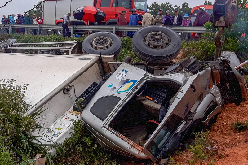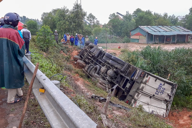 Xe ô tô tải đông lạnh 51C - 480.23, chạy trên QL1 theo hướng Nam - Bắc, khi đến đoạn Km 777+ 100 (Dốc Son, thôn Thượng Xá) thì bất ngờ mất lái đâm gãy một đoạn hộ lan bên phải đường rồi lao xuống, lật nhào bên đường. Lúc này trên xe có 3 người.