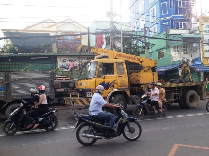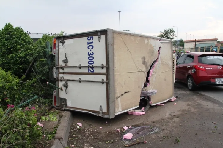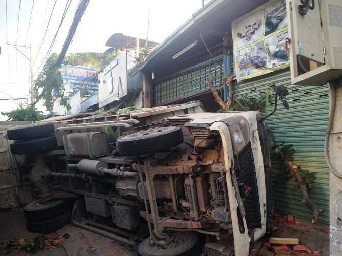Cú va chạm đã khiến chiếc xe tải lệch hướng, lao lên vỉa hè, lật nhào sau khi đâm gãy hai cây xanh, thùng xe đổ vào cửa một ngôi nhà số 190 và 192 Đặng Văn Bi (P. Bình Thọ) khiến cửa hai căn nhà này hư hỏng nặng, nhiều đồ đạc trong nhà bể nát.