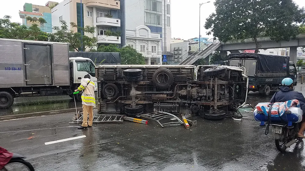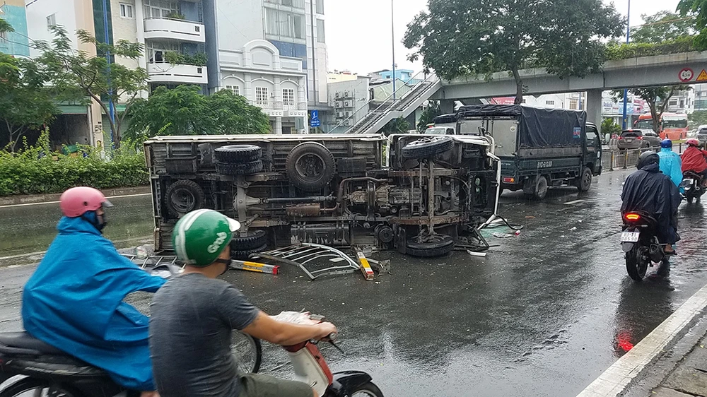Khi đến khu vực cầu đi bộ Số 6 (quận 6, TP.HCM), thì bất ngờ tông ngã gần 20 mét đoạn dải phân cách bằng thép, lao sang làn xe máy, lật ngang. Toàn bộ hàng hóa trên xe tải bị đổ tràn ra đường.