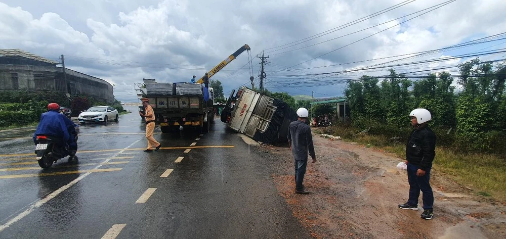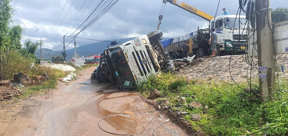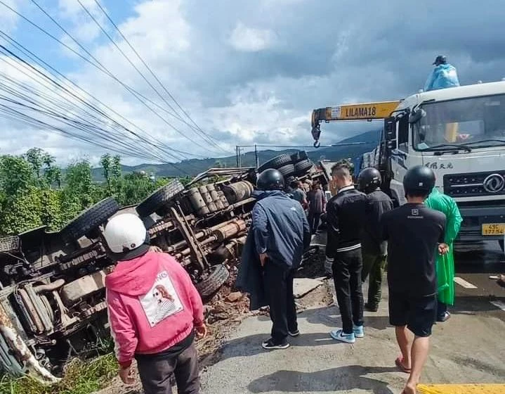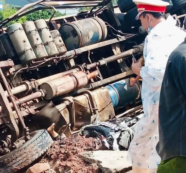 Chiếc xe tải đã lật ngang, đè xe máy rồi lật xuống vực bên đường. Vụ tai nạn khiến hai người đi xe máy tử vong.