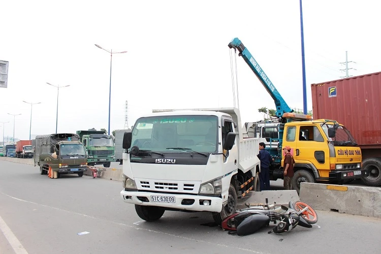 Chưa dừng lại ở đó, chiếc xe tải tiếp tục lao vào dải phân cách phân chia giữa làn ô tô - xe máy và cán vào chiếc xe máy biển số 54 Z8- 2191 rồi mới dừng lại. Vụ tai nạn khiến hai người đàn ông đi trên xe máy bị thương nặng, giao thông tại khu vực hỗn loạn.