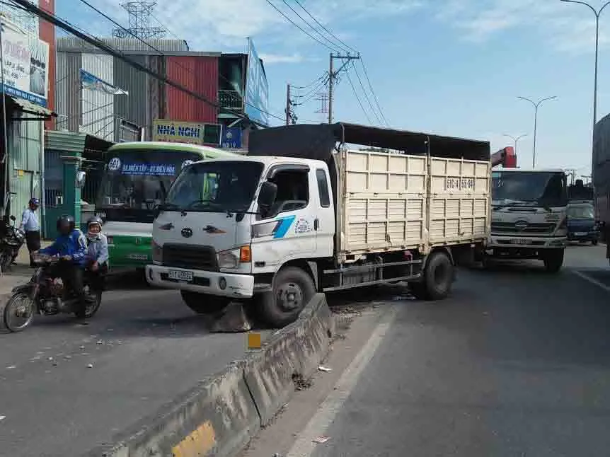 Vụ va chạm khiến xe tải mất lái, đâm va liên tiếp vào phương tiện, dải phân cách rồi lao sang làn xe máy. Rất may là hai đoạn dải phân cách vô tình thành vật chèn bánh xe tải làm chiếc xe này kịp dừng lại trước khi lao vào đám đông.