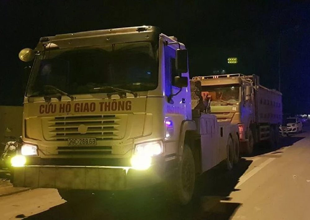 Xe cẩu được điều động đến cẩu xe tải về nơi tạm giữ.