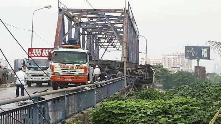 Sáng 14-11, xe tải chở hàng qua cầu Rào, quận Dương Kinh (Hải Phòng) thì nổ lốp và mất lái.