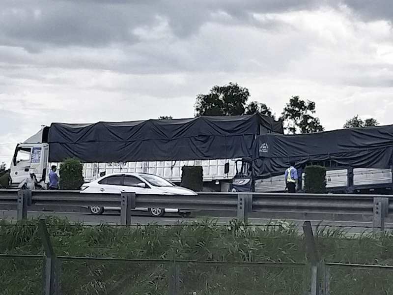 Hai phương tiện nằm chắn hơn một làn đường trong dải phân cách khiến giao thông qua khu vực bị ùn ứ, hàng trăm phương tiện nối đuôi nhau kéo dài đến đoạn rẽ vào trạm thu phí Tân An.