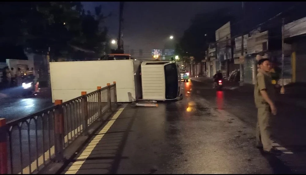 Vào khoảng 1h sáng ngày 4-6, xe tải lật ngang đã được cứu hộ, mặt đường Quang Trung thông thóang trở lại.