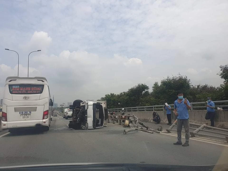 Đến trưa 28-5, Công an quận 2, TP.HCM phối hợp với đơn vị quản lý đường cao tốc giải quyết xong hiện trường vụ việc một ô tô tải bị lật.